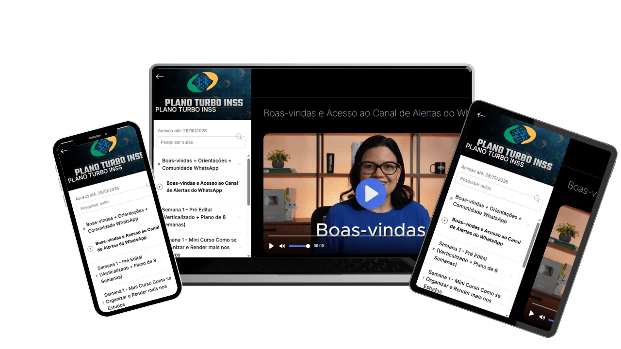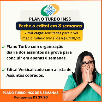 O Plano Turbo INSS é um cronograma semanal e diário que vai te ajudar a finalizar o estudo em apenas 8 semanas. Além disso, você terá acesso ao edital verticalizado do INSS, ou seja, tudo que você precisa para não se sentir perdido, se organizar, começar do jeito certo e fechar o conteúdo programático.